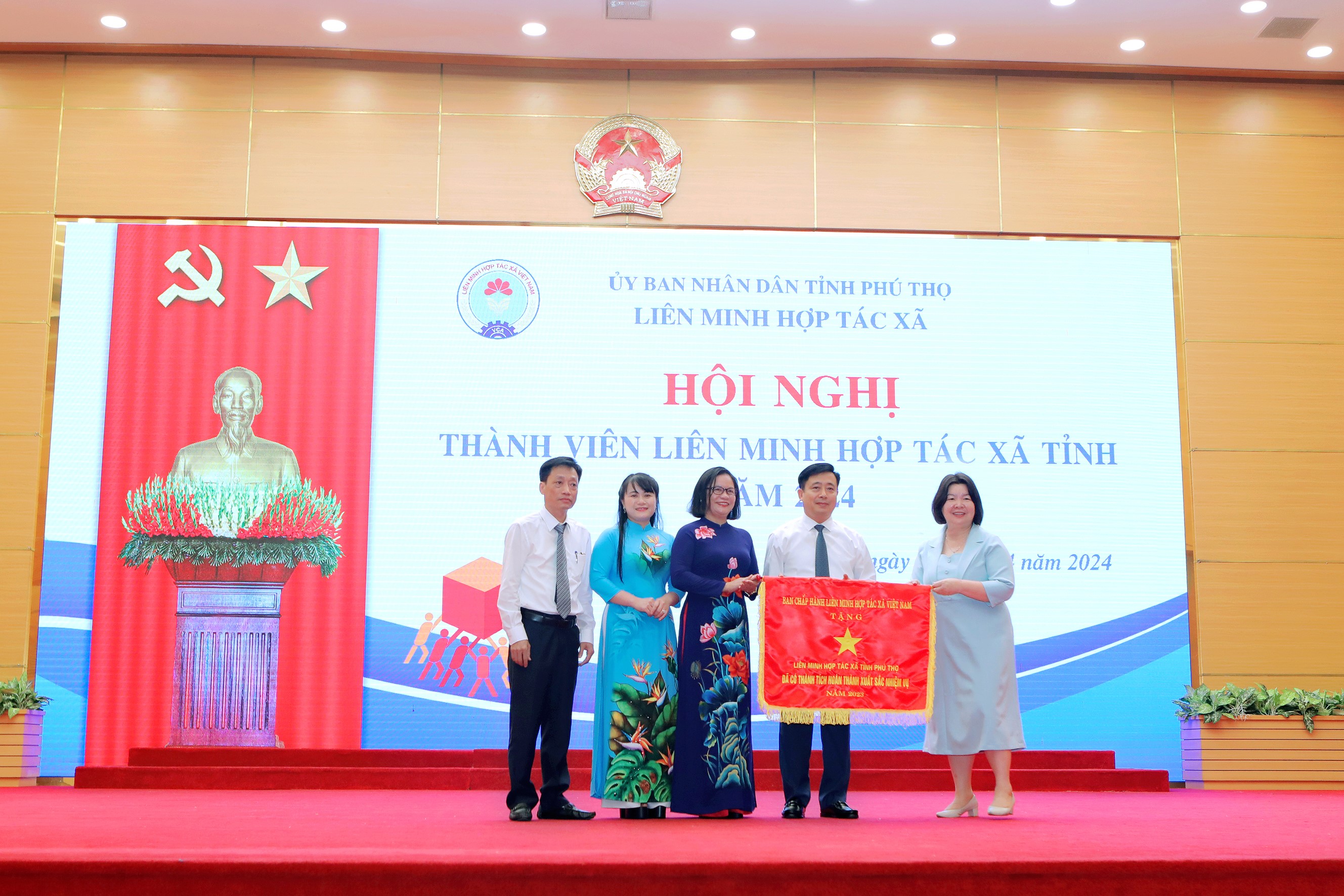 Đồng chí Cao Xuân Thu Vân - Bí thư Đảng đoàn, Chủ tịch Liên minh HTX Việt Nam tặng cờ thi đua cho Liên minh HTX tỉnh Phú Thọ đơn vị dẫn đầu cụm thi đua Liên minh HTX các tỉnh Tây Bắc năm 2023