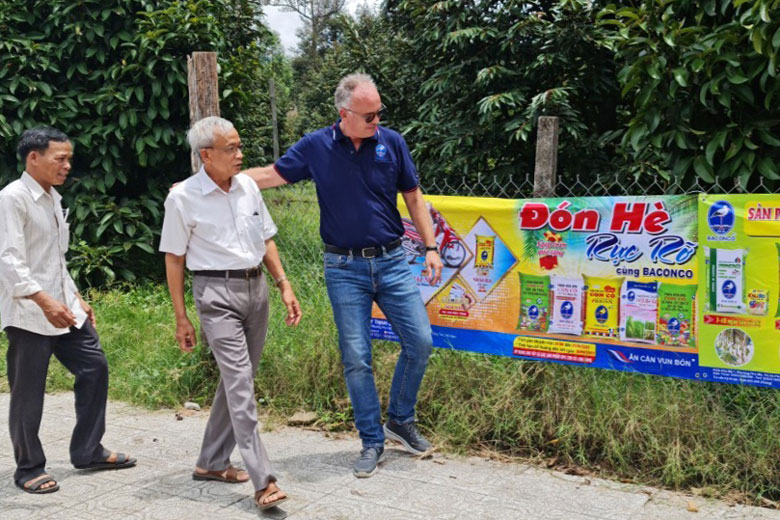 Lão nông Nguyễn Thanh Sơn (giữa) tìm đến các doanh nghiệp, chuyên gia trong và ngoài nước để giúp người trồng sầu riêng của HTX sản xuất theo tiêu chuẩn VietGap, hữu cơ