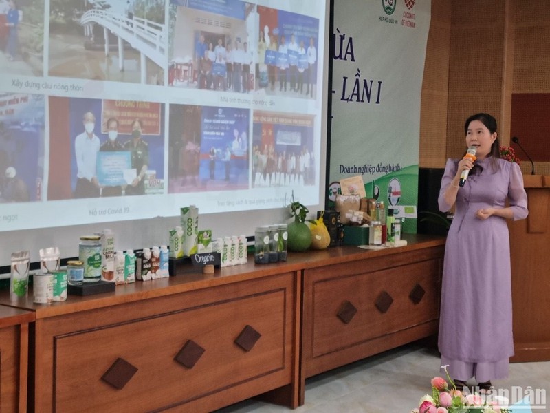 Bên cạnh đó, đại diện Trung tâm Phát triển kinh tế nông thôn (CRED) đã giới thiệu những ưu đãi từ dự án Biotrade (do Cục Kinh tế của Liên bang Thụy Sỹ tài trợ) dành cho ngành dừa và các ngành liên quan cây dừa ở Việt Nam. Đây là dự án hỗ trợ các hoạt động thu hái, sản xuất và kinh doanh, buôn bán hàng hóa và dịch vụ có nguồn gốc từ đa dạng sinh học tự nhiên, theo các tiêu chuẩn bền vững về môi trường, xã hội và kinh tế.