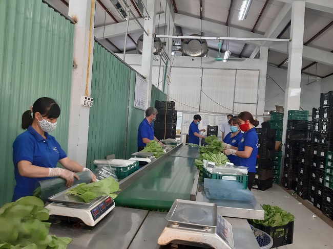 Sơ chế và đóng gói rau xanh ở Hợp tác xã Rau quả sạch Chúc Sơn (huyện Chương Mỹ).
