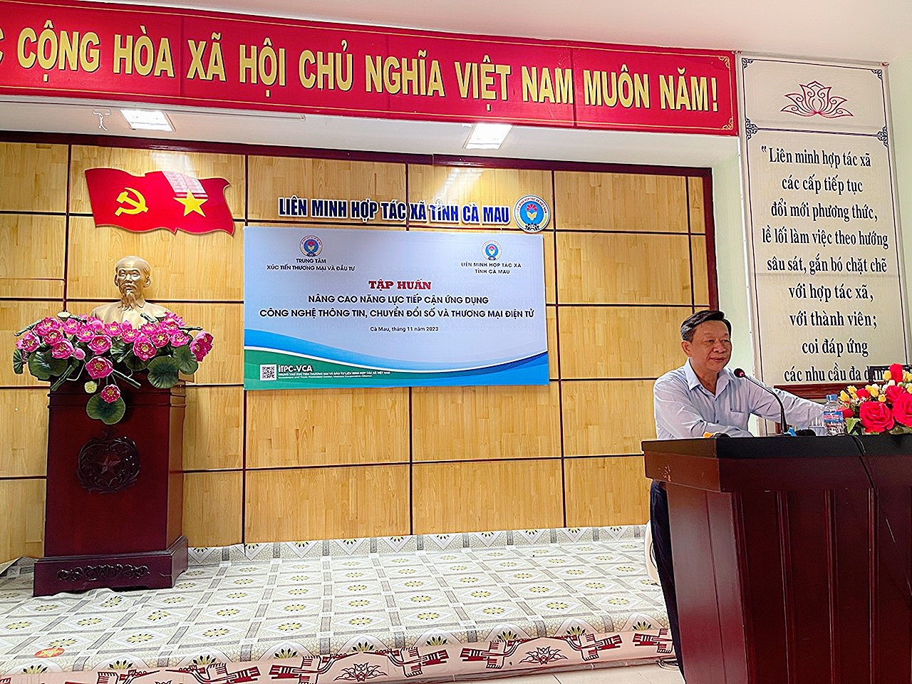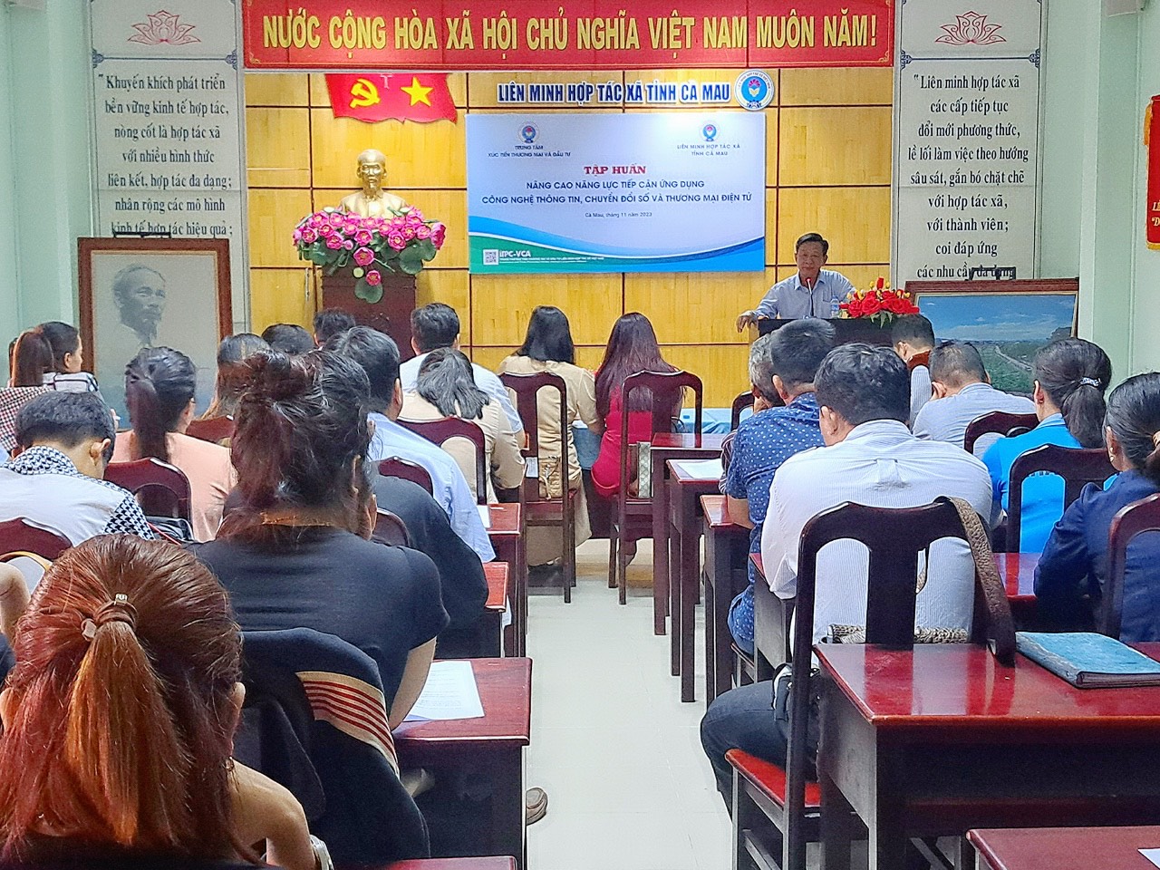 Triển khai chương trình làm việc giữa Liên minh Hợp tác xã Việt Nam và UBND tỉnh Cà Mau, ngày 31/10, Trung tâm Xúc tiến thương mại và Đầu tư, Liên minh Hợp tác xã Việt Nam phối hợp với Liên minh Hợp tác xã tỉnh Cà Mau tổ chức tập huấn nâng cao năng lực tiếp cận ứng dụng công nghệ thông tin, chuyển đổi số và thương mại điện tử.