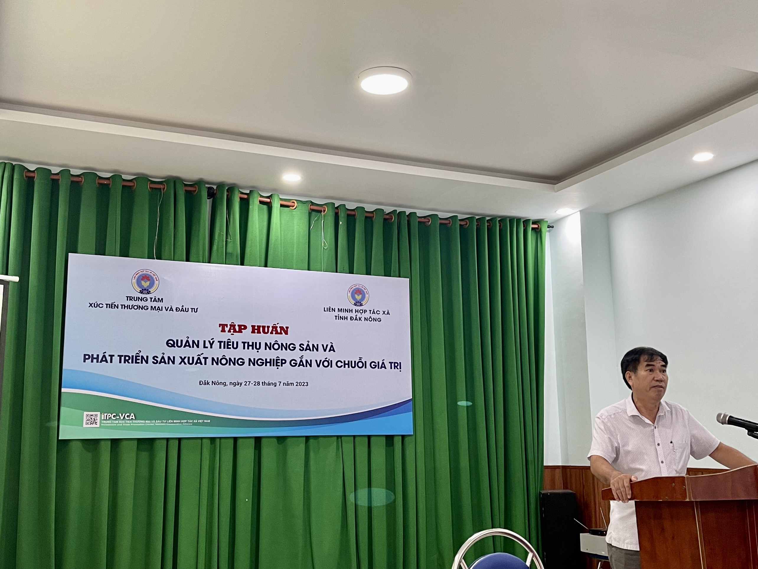 Ngày 27 tháng 7 năm 2023, tại thành phố Gia Nghĩa, Trung tâm Xúc tiến thương mại và Đầu tư trực thuộc Liên minh Hợp tác xã Việt Nam phối hợp với Liên minh Hợp tác xã tỉnh Đắk Nông tổ chức lớp: “Tập huấn Quản lý tiêu thụ nông sản và phát triển sản xuất nông nghiệp gắn với chuỗi giá trị”. Cho hơn 60 cán bộ là Giám đốc Hợp tác xã và thành viên là người đồng bào dân tộc thiểu số M’nông và người Mông là thành viên các hợp tác xã thuộc hai huyện đặc biệt khó khăn, biên giới Đắk G’long và huyện Tuy Đức về tham dự, Về dự tổ chức và chỉ đạo lớp tập huấn có đồng chí Vũ Thu Hà – Chánh Văn phòng và Thạc sỹ giảng viên Trịnh Anh Tuấn - Trung tâm Xúc tiến thương mại và Đầu tư thuộc Liên minh Hợp tác xã Việt Nam; về phía Liên minh Hợp tác xã tỉnh Đắk Nông có đồng chí Đặng Quốc Dưỡng – Phó Chủ tịch và cán bộ, chuyên viên Phòng Chính sách tuyên truyền phát triển trực thuộc.