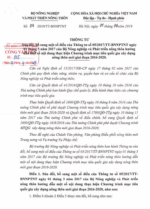 Thông tư sửa đổi, bổ sung một số điều của Thông tư số 05/2017/TT-BNNPTNT ngày 01 tháng 03 năm 2017 của Bộ Nông nghiệp và Phát triển nông thôn hướng dẫn một số nội dung thực hiện Chương trình mục tiêu Quốc gia xây dựng nông thôn mới giai đoạn 2016 - 2020.