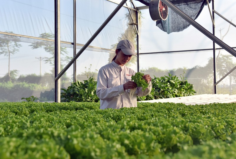 | Kỹ sư nông nghiệp Công ty Declo Farm (tỉnh Bắc Ninh) kiểm tra tốc độ tăng trưởng của rau màu trồng trong nhà kính. (Ảnh MINH HÀ) |