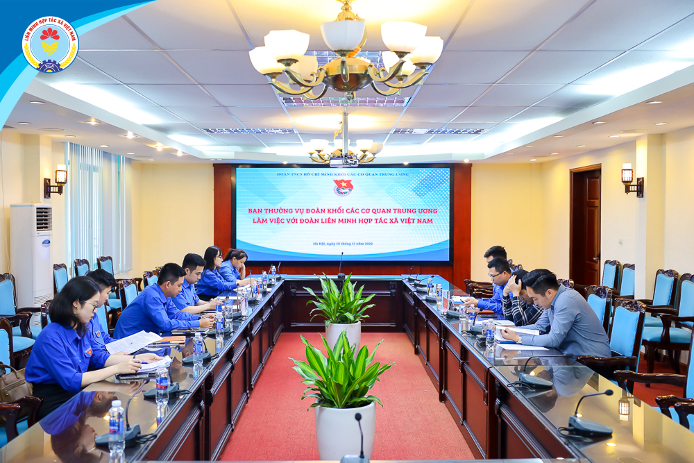 Chiều 10/11 tại trụ sở Liên minh Hợp tác xã Việt Nam, Đoàn thanh niên Liên minh Hợp tác xã Việt Nam có buổi làm việc với Ban Thường vụ đoàn khối các cơ quan Trung ương về kết quả công tác đoàn và phong trào thanh niên gắn với việc thực hiện nhiệm vụ chính trị của cơ quan từ đầu năm 2022 đến tháng 10/2022 và một số việc đã triển khai từ sau Đại hội đại biểu Đoàn TNCS Hồ Chí Minh Liên minh Hợp tác xã Việt Nam khóa IV, nhiệm kỳ 2022-2027. Dự và chủ trì buổi làm việc có đồng chí Đồng chí Nguyễn Ngọc Điệp – Phó Bí thư Đoàn Khối, Chủ nhiệm Uỷ ban Kiểm tra Đoàn Khối, Trưởng đoàn Công tác.
