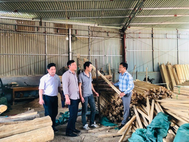 Anh Nguyễn Văn Cường - Tổ trưởng Tổ hợp tác Cường Ly (người mặc áo phông đứng giữa) và các đồng chí Lãnh đạo Liên minh HTX tỉnh Yên Bái tại xưởng sản xuất của Tổ hợp tác