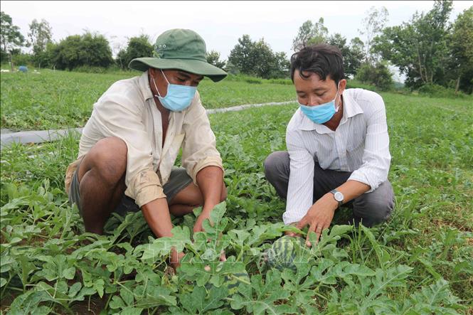 Ông Thạch Sa Quơne (bên trái), xã Long Sơn, huyện Cầu Ngang chăm sóc ruộng dưa 0,4 ha sắp thu hoạch. Ảnh: Thanh Hòa/TTXVN