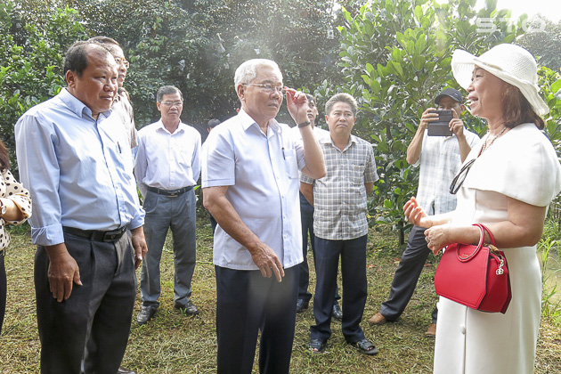 Bí thư Tỉnh ủy Phan Văn Sáu trao đổi cùng đại diện doanh nghiệp thu mua trái vú sữa tím xuất khẩu sang thị trường Hoa Kỳ. Ảnh: Thúy Liễu