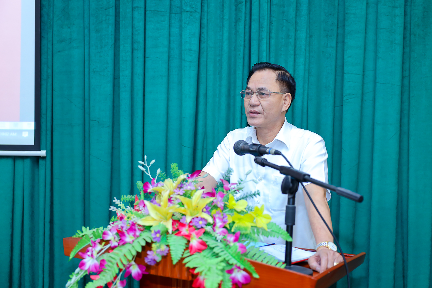 Đảng viên chi bộ Trung tâm Xúc tiến Thương mại và Đầu tư tặng hoa chúc mừng đồng chí Vũ Quang Phong, Bí thư Chi bộ Trung tâm Xúc tiến Thương mại và Đầu tư nhiệm kỳ 2022 - 2025