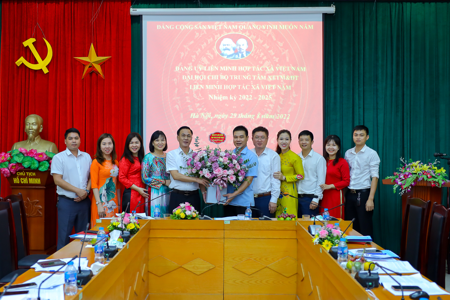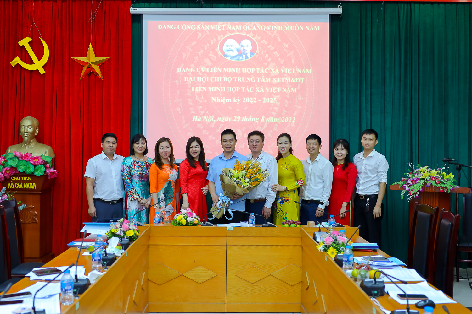 Đồng chí Nguyễn Mạnh Cường, Bí thư Đảng ủy, Phó Chủ tịch Liên minh Hợp tác xã Việt Nam tặng hoa, chụp hình lưu niệm cùng Đảng viên chi bộ Trung tâm Xúc tiến Thương mại và Đầu tư