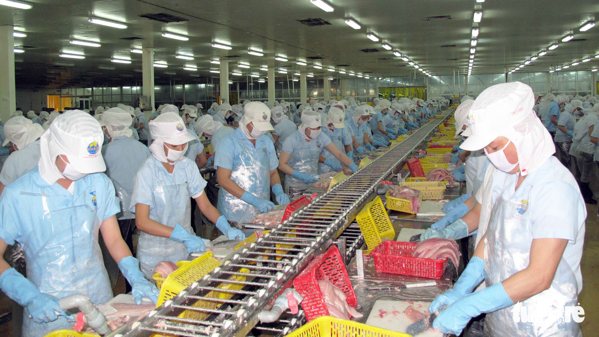 Các công nhân một doanh nghiệp thực hiện công đoạn philê cá tra để xuất khẩu - Ảnh: BỬU ĐẤU