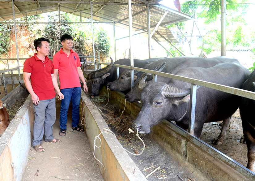 Giám đốc HTX Chăn nuôi - Kinh doanh thịt trâu, bò sạch Hàm Yên, xã Thái Sơn (Hàm Yên) trao đổi kinh nghiệm chăn nuôi trâu vỗ béo với các thành viên.