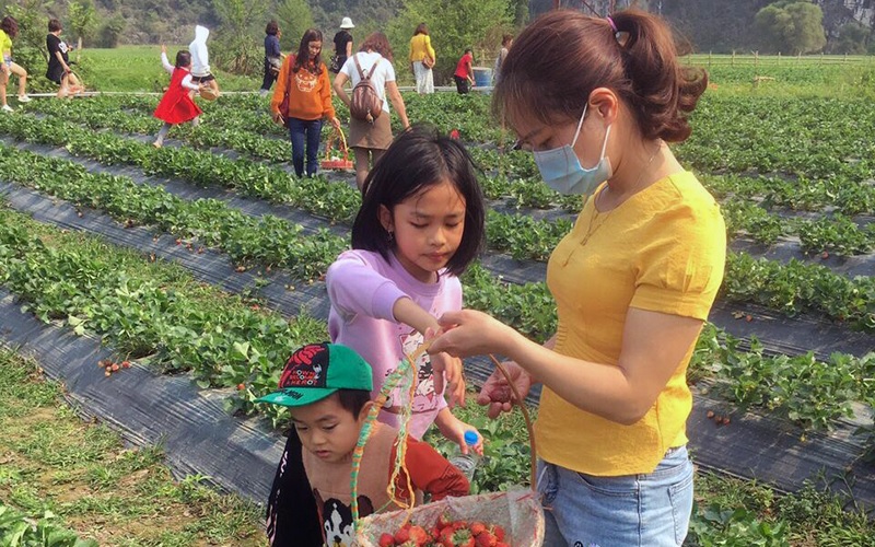 Cánh đồng dâu tây tại xã Nam Cường, huyện Chợ Ðồn (Bắc Kạn) thu hút khách tham quan.