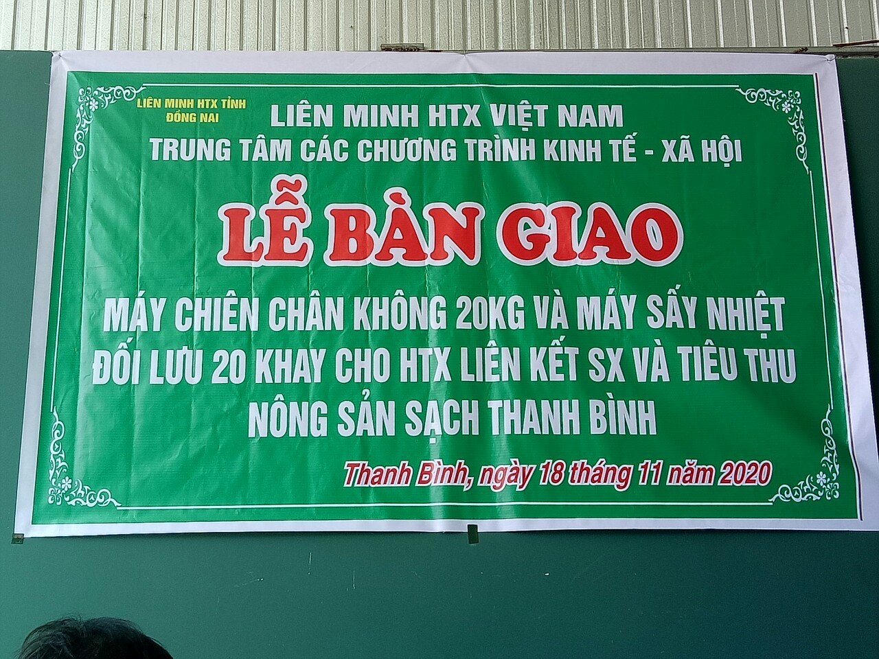 Ngày 18/11, Trung tâm các chương trình Kinh tế - Xã hội trực thuộc Liên minh HTX Việt Nam phối hợp cùng Liên minh HTX tỉnh Đồng Nai bàn giao máy móc, thiết bị sản xuất chế biến và bảo quản nông sản cho HTX liên kết sản xuất và tiêu thụ nông sản sạch Thanh Bình (Đồng Nai).