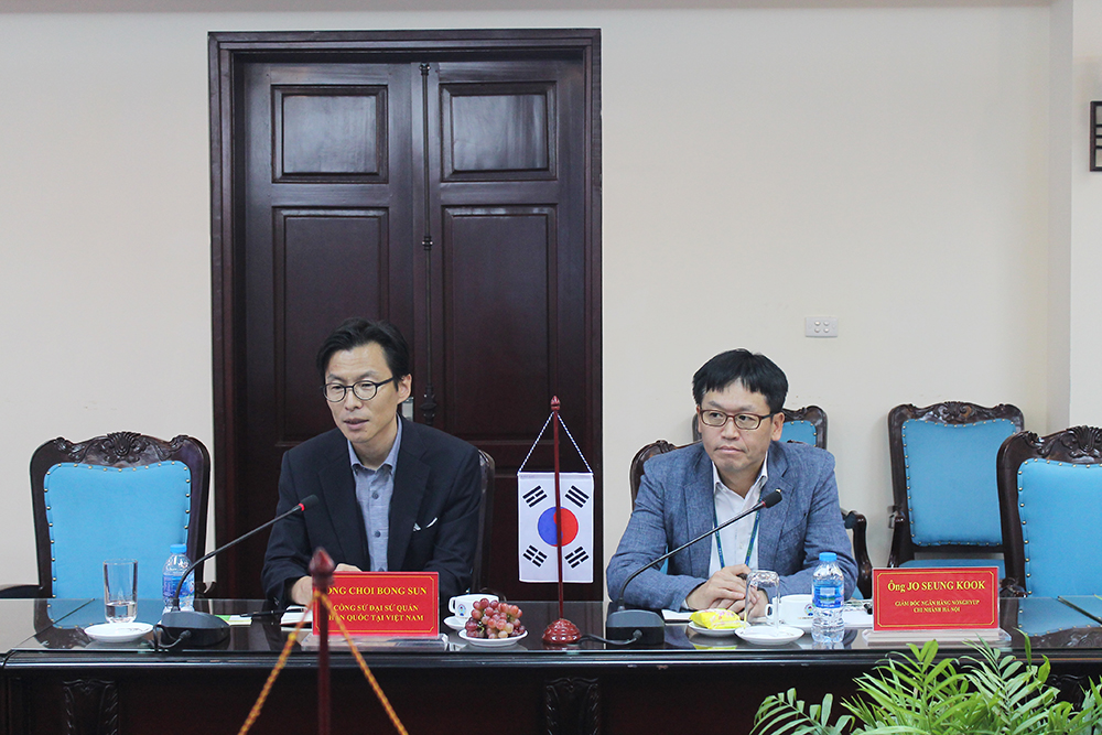Ông Choi Bong Sun, Công sứ phụ trách hợp tác nông nghiệp Việt Nam – Hàn Quốc, Đại sứ Hàn Quốc tại Việt Nam và ông Jo Seung Kook, Giám đốc ngân hàng Nonghyup chi nhánh Hà Nội phát biểu tại buổi làm việc