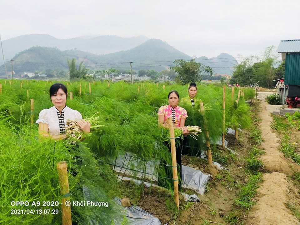 Thành viên HTX nông nghiệp Vũ Thịnh (Văn Chấn) thu hoạch Măng Tây- sản phẩm được thị trường ưa chuộng.